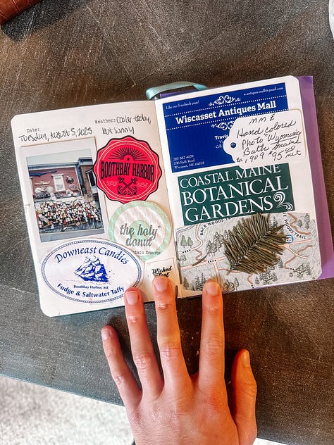 I filled each page with items I collected, representing what Max and I did each day of our trip. The first day, we landed at the Boston Logan Airport, where we picked up our rental car and took our sweet time traveling to Portsmouth, New Hampshire. We stopped there for lunch and a coffee before continuing to a few other coastal towns in Maine. At each stop, I pulled out my Polaroid camera, taking pictures of lighthouses, the meals we ate, and anything else I wanted to remember, as well as collecting receipts, stickers, and maps of the places we visited. When we finally made it to our final destination of Portland, Maine, I had already gathered a nice-sized pile of memorabilia to add to day one of my travel journal.